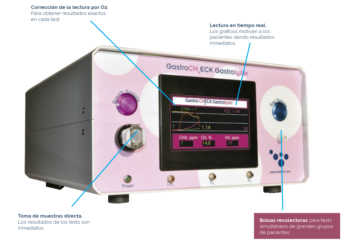 El GastroCH4ECK® es un monitor portátil de respiración de CH4, H2 y O2 que ayuda a los profesionales de la salud a detectar con precisión una variedad de trastornos gastrointestinales. Se toma una lectura de O2 para motivar a los pacientes a proporcionar una muestra final correcta de aliento. Si no pueden hacer esto, GastroCH4ECK® corregirá automáticamente la lectura, dentro de unos márgenes, lo que evitará que el paciente se sienta avergonzado y así no tendrá que realizar otra prueba.
