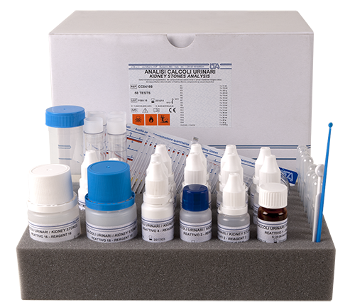 Kit preparado para la determinación colorimétrica de carbonato, calcio, magnesio, amonio, oxalato, fosfato, ácido úrico y cistina en piedras en los riñones y vías urinarias.
